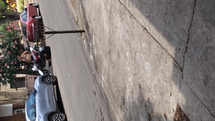 A man stands shirtless next to a red and white motorcycle, parked on a street beside a silver car. Lush greenery with pink flowers frames the scene on the left. Two cars are visible further up the road. The street is concrete with visible cracks and uneven textures. A shadow covers a large portion of the right side of the frame.
