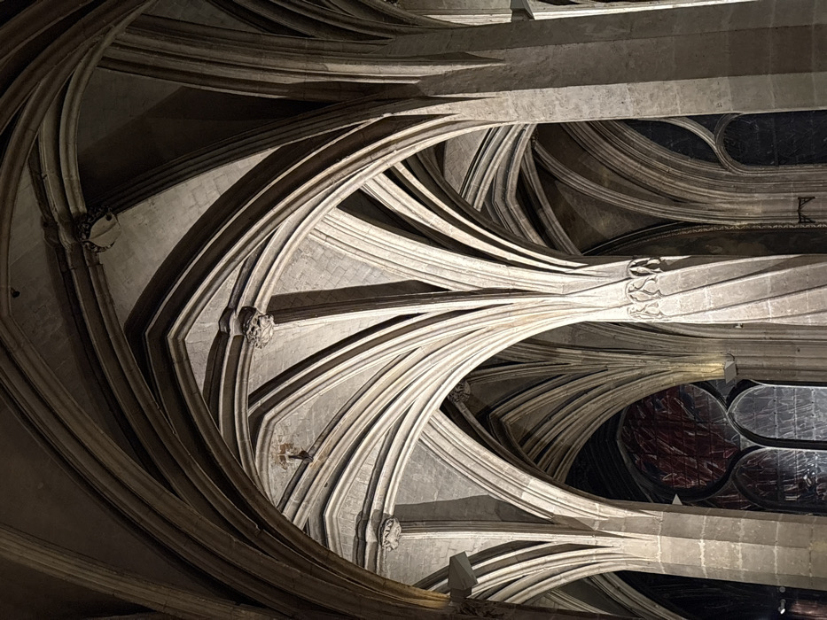 The image depicts an interior architectural detail, likely a vaulted ceiling. Ribbed stone arches converge, creating a complex, interwoven pattern. Carved floral or foliate details punctuate the intersections of the ribs. One section reveals a glimpse of stained-glass windows in dark red hues. The stone is light-colored, likely limestone, and lit with a soft, ambient light, casting shadows that enhance the three-dimensional effect of the vaulting.
