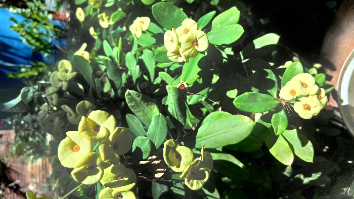 A vertical image displays a *Euphorbia milii* plant, characterized by numerous clusters of light yellow-green bracts, each with an orange-yellow center, and dark green, ovate leaves. The plant is illuminated by direct sunlight, casting distinct shadows. The background is blurred, showing reddish-brown textured surfaces, additional green foliage, and a prominent blue object. A segment of a white or light-colored planter is visible at the bottom of the frame. The scene is located in La Tagua, Venezuela. No individuals, actions, or direct interactions are depicted.