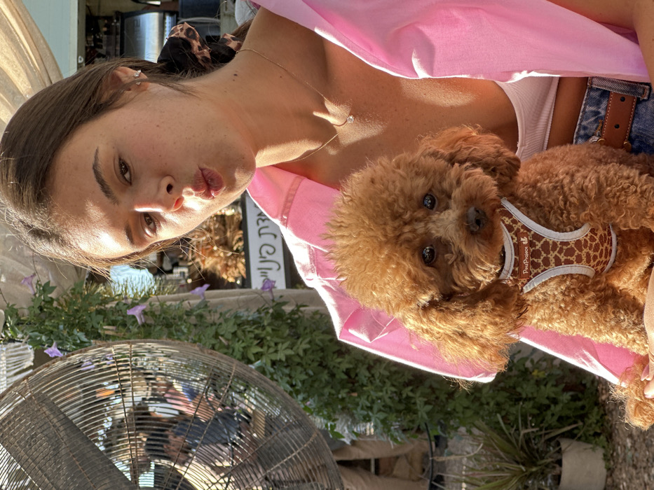 The image depicts a young adult female holding a small, reddish-brown curly-haired dog in an outdoor setting in Kfar Ruth, Israel. The female, positioned centrally, faces the camera with a pursed-lips expression. She has dark brown hair, partially secured by a leopard-print scrunchie visible behind her right ear, and wears an open pink collared shirt over a white tank top, blue jeans, and a delicate necklace with a single clear stone pendant. The dog, a Poodle type, is held in her arms and wears a brown and beige giraffe-print harness with the brand "PawProject" visible. The dog looks directly forward. The background on the left features a large, industrial-style oscillating fan, reflecting blurred figures of other individuals. To the right of the fan, a green vine with purple flowers grows vertically, and a partially visible white sign with Hebrew text, including "שבת פירות," is present. The scene is illuminated by strong, natural sunlight, casting highlights and shadows.