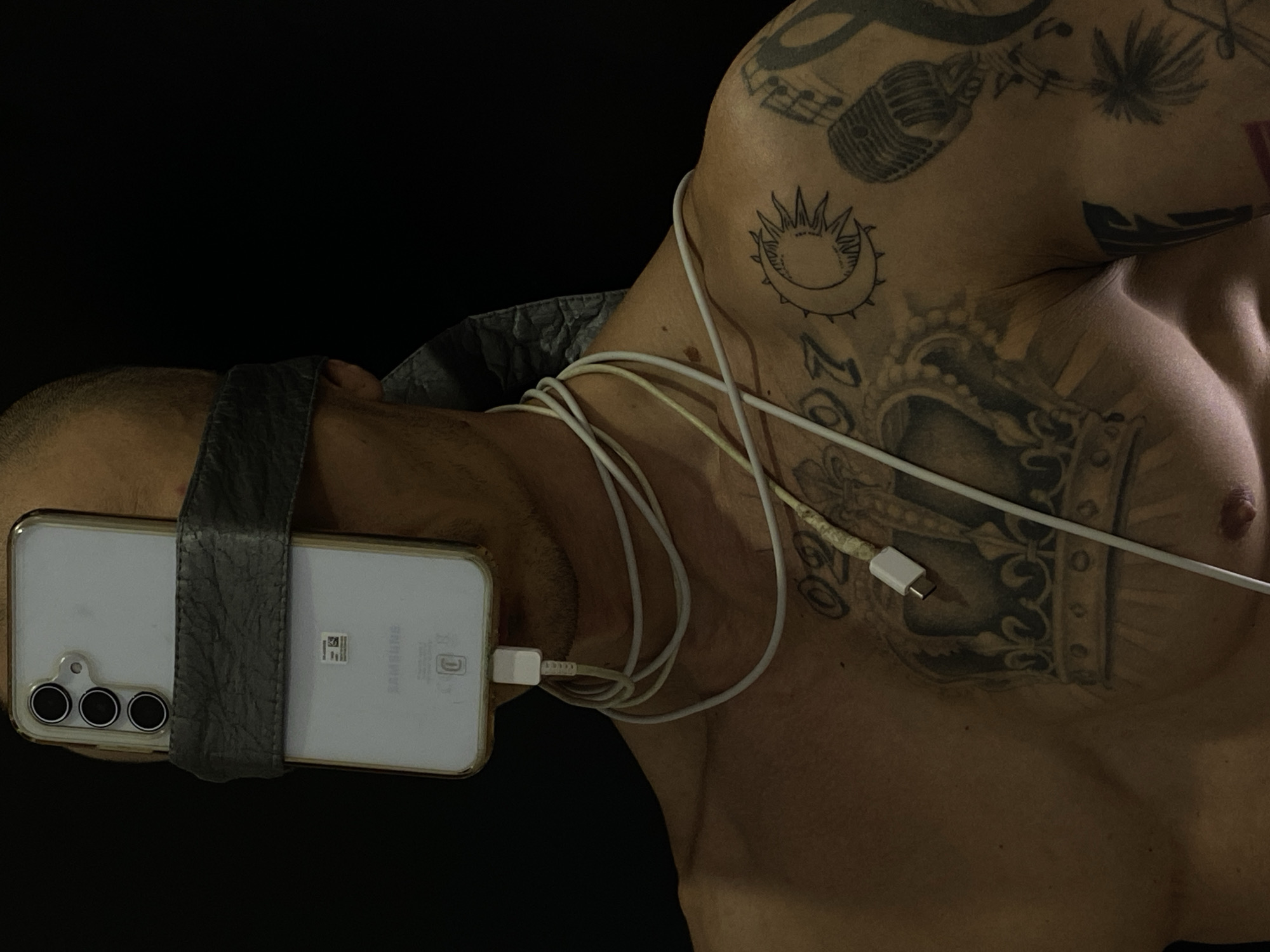 A shirtless man is turned to the side. A gray, cushioned band is wrapped around his head, holding a white smartphone against his forehead. The phone has three camera lenses visible. Several white charging cables are draped around his neck and upper chest, some of which are plugged into the phone. The man has several tattoos on his shoulders and chest, including a microphone, a sun with crescent moon, and a crown. The background is black. There is no indication of the city of Pleven, Bulgaria.