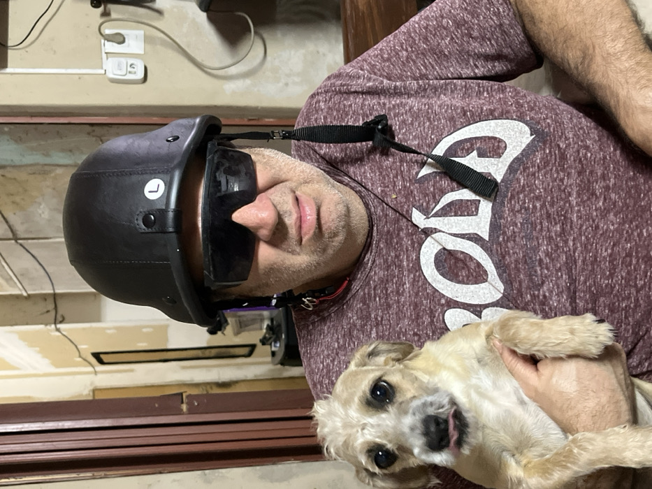 An adult male is observed indoors in San Fernando del Valle de Catamarca, Argentina. He wears a black, German-style half-helmet with a white 'L' size sticker on the viewer's right side, and dark, rectangular sunglasses that obscure his eyes. His face exhibits light-colored stubble, and his mouth is closed. He is dressed in a mottled maroon short-sleeved t-shirt featuring a partial white graphic text. The man holds a small dog, characterized by light brown and white fur, floppy ears, and a slightly extended tongue. Both the man and the dog are oriented towards the camera. The background on the left consists of a dark brown vertical structure, possibly a door frame, in front of a light-colored wall showing exposed wallboard or plaster. The background on the right presents a light-colored wall with visible black wiring and two white electrical outlets, one containing a white plug. The scene is illuminated by indoor lighting.