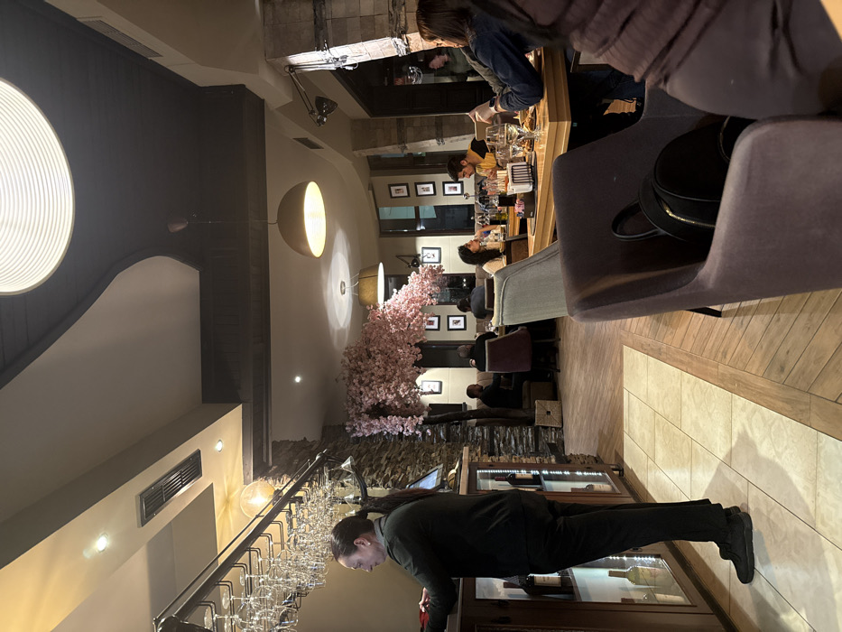 The image captures the interior of a restaurant located in Razlog, Bulgaria. The scene depicts a moderately occupied dining area with warm, ambient lighting. In the left foreground, a male, identified as a server, is positioned behind a dark wooden bar counter. He has dark hair tied back, is dressed in a dark long-sleeved shirt and dark trousers, and appears to be attending to items on the counter. The bar features transparent display compartments holding wine bottles, and an overhead rack suspends numerous clear wine glasses. The wall behind the bar is constructed from stacked stone. A prominent decorative element in the mid-ground is a large, artificial cherry blossom tree with pink flowers, extending from the stone wall. Beyond this, multiple patrons are seated at various tables. In the center-right, a group of individuals occupies a wooden table. One male with dark hair and a beard, wearing a yellow-collared shirt, is looking towards a female with dark hair in a light top. Food plates, wine bottles, and drinking glasses are present on their table. Closer to the right foreground, an individual, likely female, is seated with their back partially to the camera in a purple upholstered chair, with a black backpack resting in an adjacent chair. Other patrons are visible further back in booths. The ceiling features a multi-layered design with sections of white and dark gray, incorporating recessed spotlights and various hanging light fixtures, including a large, ribbed circular light in the upper left and spherical pendant lights. The floor transitions from light-colored square tiles near the bar to a light wood-look flooring laid in a herringbone pattern throughout the main dining area.