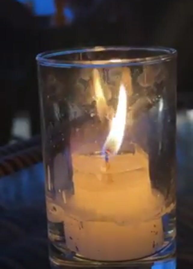 lit white candle inside a clear glass container on a dark table. The candle flame flickers. In the background, blurry figures suggest people, one possibly holding a blue phone. The scene is dimly lit, possibly outdoors at dusk or night.