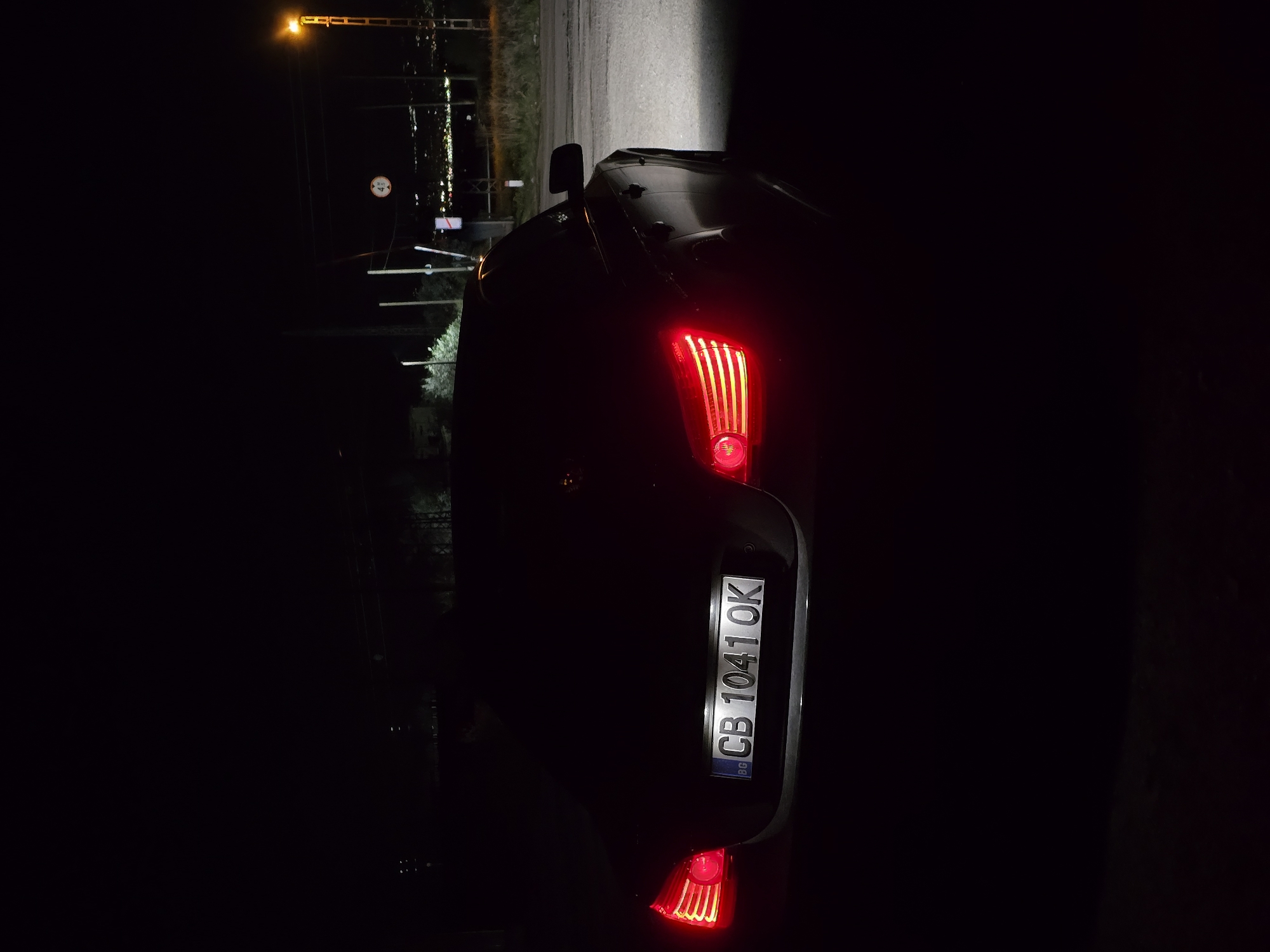 rear of a dark-colored car with Bulgarian license plate "CB 1041 OK". The car's brake lights are illuminated. The environment is dark, but a distant street light and other lighting indicate an urban setting. The image was taken at night. Considering the "CB" license plate prefix, the location may be in the city of Sofia, Bulgaria. The specific location cannot be confirmed with certainty.