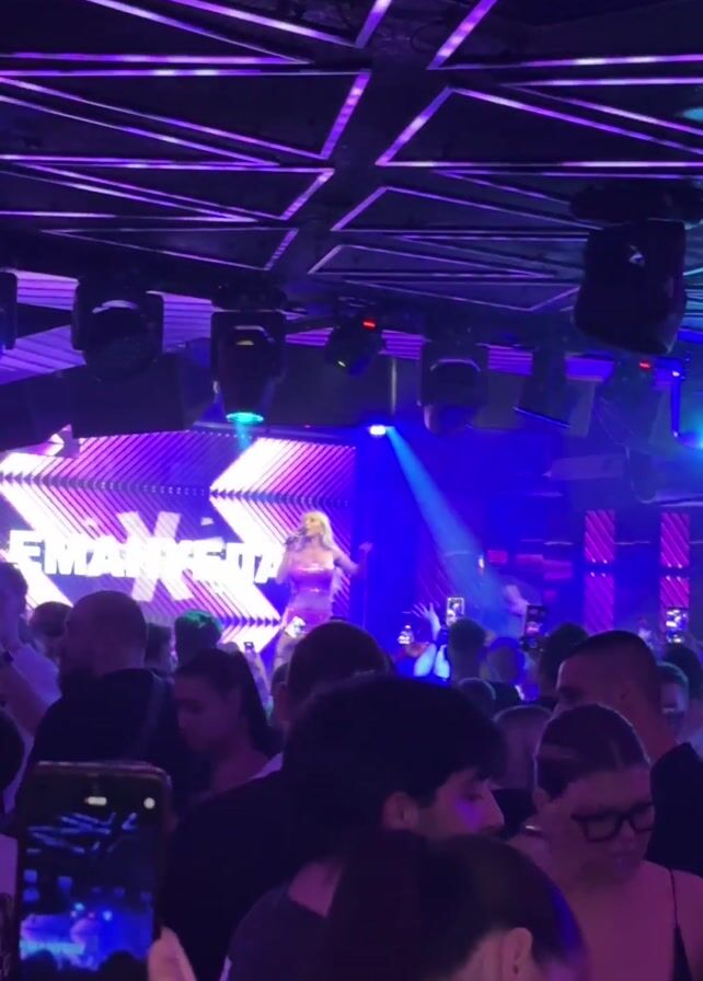 The video depicts a performance by a blonde female singer on a stage in a crowded nightclub