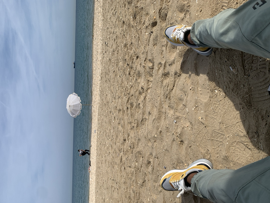 This image depicts a beach scene in M'diq, Morocco, from a first-person perspective. In the foreground, two legs encased in light green pants and light-colored sneakers with prominent yellow and grey accents are extended forward onto light brown sand. Shadows from the viewer's body are cast to the right. The midground features a sandy beach with a visible line of small pebbles or shells near the water's edge. A white and grey striped beach umbrella is positioned upright in the sand, approximately centrally. To the left of the umbrella, a single individual, dressed in dark clothing (black shirt, dark pants), is seen in a bent or crouched posture near the waterline, facing towards the water. A small, indistinct bundle, possibly clothing or towels, lies on the sand near this individual. The background consists of the calm, blue-green sea extending to the horizon under a light blue sky with sparse, wispy white clouds. A dark-hulled vessel, likely a ship, is visible in the distance on the water towards the right side of the frame. The overall scene is illuminated by daylight.
