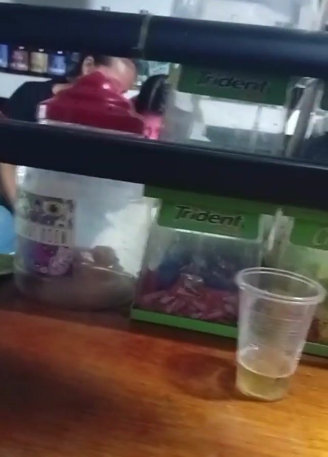 counter in what appears to be a store or shop. The counter is made of wood. Various items are placed on the counter, including containers of candy, gum (Trident and Chiclets), a partially filled clear plastic cup with a yellow liquid, and a folded bill (apparently Dominican currency). Behind the counter is a shelf with various items, including what appears to be a computer and bottles. A person can be seen in the background but is largely out of focus. There's ambient noise present in the video.