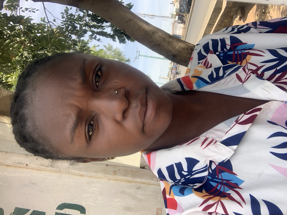 An individual, identified as an adult female with dark skin and dark, braided hair pulled back, is depicted in a close-up outdoor shot in Gombe, Nigeria