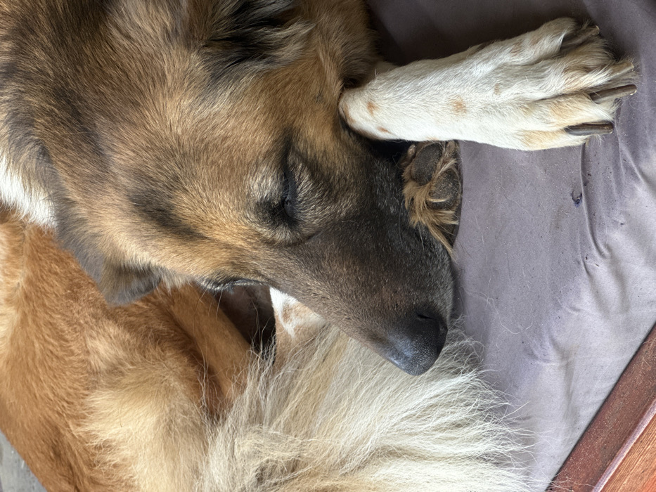 In Beit Yitshak Sha'ar Hefer, Israel, a medium to large-sized dog is depicted sleeping in a curled position on a purple-grey fabric surface. The dog's head, featuring predominantly brown and tan fur with darker markings around the face, rests on or near its front paws. Its eyes are closed. The fur on the visible body and tail section is a lighter golden-tan or off-white. One front paw, characterized by white fur with reddish-brown spots and dark claws, is visible beneath the dog's chin. The fabric surface exhibits minor wrinkles and particulate matter. A dark wooden edge is present along the lower-left perimeter of the image frame.