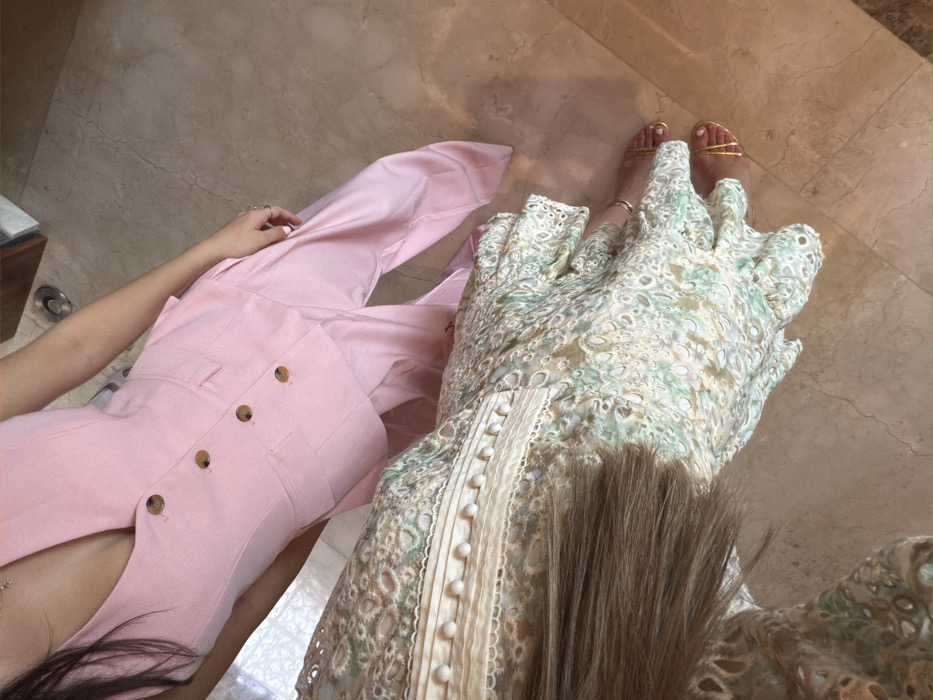The image displays a high-angle view of two individuals standing on a polished, light brown or beige tiled floor. The specific location within Monterrey, Mexico, cannot be determined from the visual evidence. The individual in the foreground, positioned on the left, wears a long, flowing dress featuring a light green, beige, and white patterned fabric with a textured finish. A horizontal decorative band with white circular accents and lace trim is visible across the upper portion of the dress. Long, straight, medium-brown hair is draped over the left side of this dress. This individual's feet wear gold-colored, thin-strapped sandals, and a gold-colored anklet is present on one ankle. The individual in the background, positioned on the right, is clothed in a pink two-piece outfit comprising a sleeveless, V-neck vest top with four light brown buttons arranged vertically down the front and small flap pockets, paired with matching wide-leg trousers. A hand, with light-colored painted fingernails and a ring on one finger, is visible near the waist area. The floor exhibits faint reflections of ambient light. No discernible objects or further environmental details are visible in the background beyond the individuals and the floor.