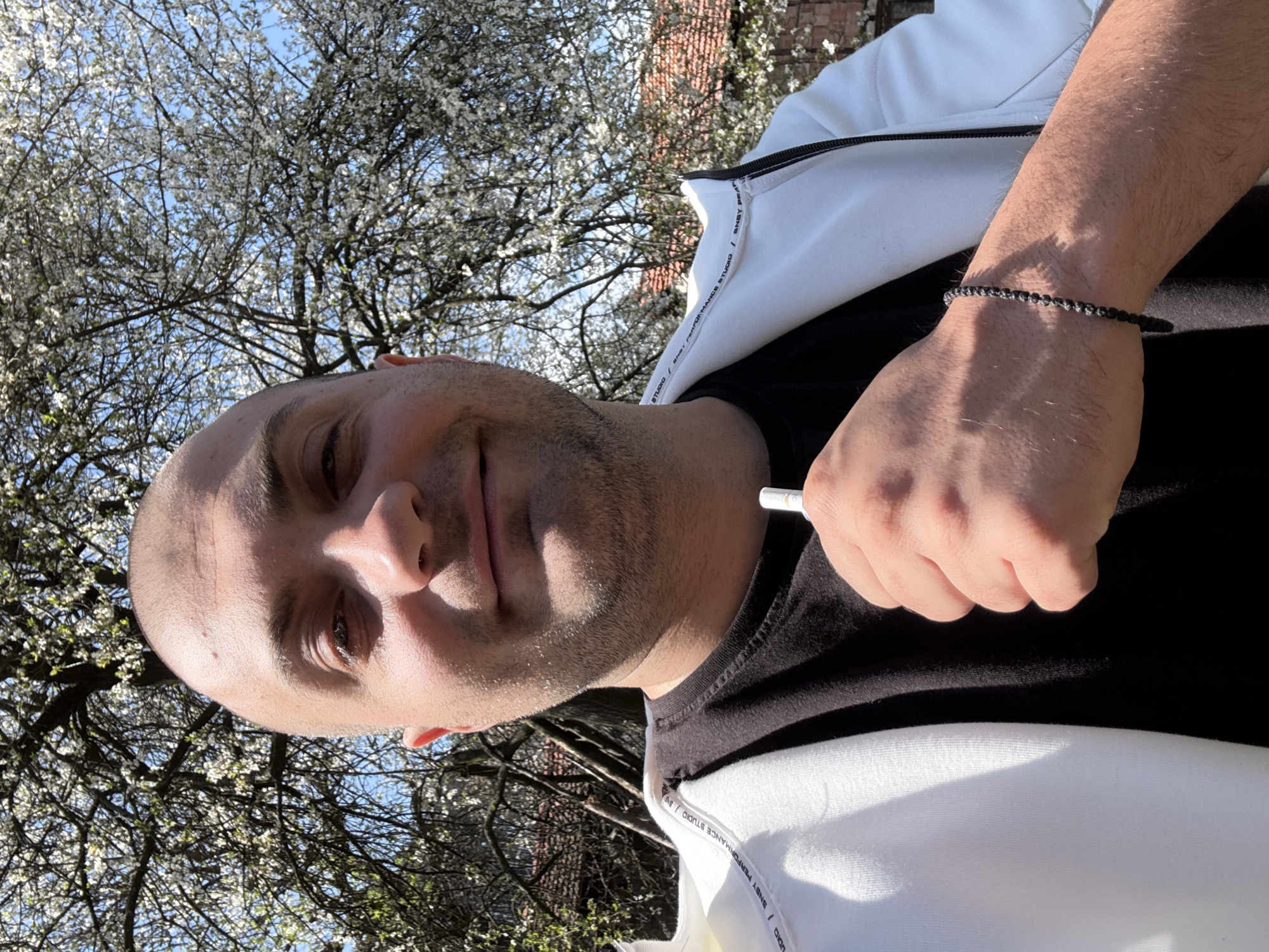 A man takes a selfie outdoors with blooming white trees in the background. The man has a shaved head and a light complexion. He is wearing a black t-shirt and a white jacket with black trim. He is holding a white cigarette in his hand. A bracelet is on his wrist. The precise location is unknown and cannot be determined from the image, and it is not possible to confirm that the image was taken in Gabrovitsa, Bulgaria.