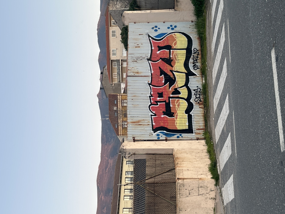 The image depicts a street scene in Piedrahíta, Spain, at what appears to be either dawn or dusk, indicated by the clear, pale blue sky and the warm light on distant mountains. In the immediate foreground, an asphalt road with a faded white pedestrian crosswalk extends horizontally. Above the crosswalk, a small strip of green vegetation grows at the base of a low, light-colored concrete wall, which transitions into a chain-link fence topped with barbed wire on the left side of the frame. Dominating the midground is a large, corrugated metal gate, heavily rusted with a light blue-grey base peeking through extensive brown and orange discoloration. This gate is adorned with a prominent graffiti tag, featuring stylized, bubble-like letters filled with a gradient transitioning from red and orange at the top to yellow at the bottom, outlined in black with a thin white border. Small blue paint drips or dots flank the left and right edges of the graffiti. Legible text "2024." is visible below the graffiti on the left, and "SMARTIEVS" (or similar) on the right. The gate is supported by robust, light-colored concrete pillars on either side, with only the left pillar fully visible. In the background, a cluster of buildings comprises various architectural styles typical of a Spanish town. To the far left, a multi-story structure with a light-colored facade and numerous windows is visible. Behind the gate, several houses feature terracotta-tiled roofs, light-colored walls, and multiple windows and balconies. Beyond the urban structures, a range of mountains, illuminated with a warm, reddish-brown hue, stretches across the horizon under the clear sky. No individuals or active interactions are present in the scene.