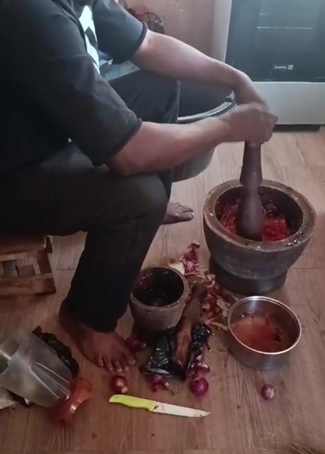 A man is grinding ingredients in a large mortar and pestle, sitting on a small wooden stool on a wooden floor. He is barefoot and wearing dark pants and a black short-sleeved shirt with a white logo on the chest. He is using the pestle to mash red ingredients in the mortar. Around him on the floor are several small red onions, a yellow-handled knife, a silver container, a dark-colored bowl, a metal bowl with reddish liquid, and a couple of plastic bags. Behind him, a white oven is visible. The man appears to be preparing food.