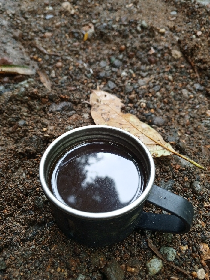 A dark-colored metal mug containing a dark liquid, presumed to be coffee, rests on damp, dark brown soil mixed with pebbles and small stones. The liquid surface reflects overhead light and indistinct shapes, possibly foliage. A single dry, light brown leaf is positioned behind and to the right of the mug on the ground. Additional small organic debris is scattered across the soil. No individuals are present. The scene is located outdoors in Silvino Lobos, Philippines.