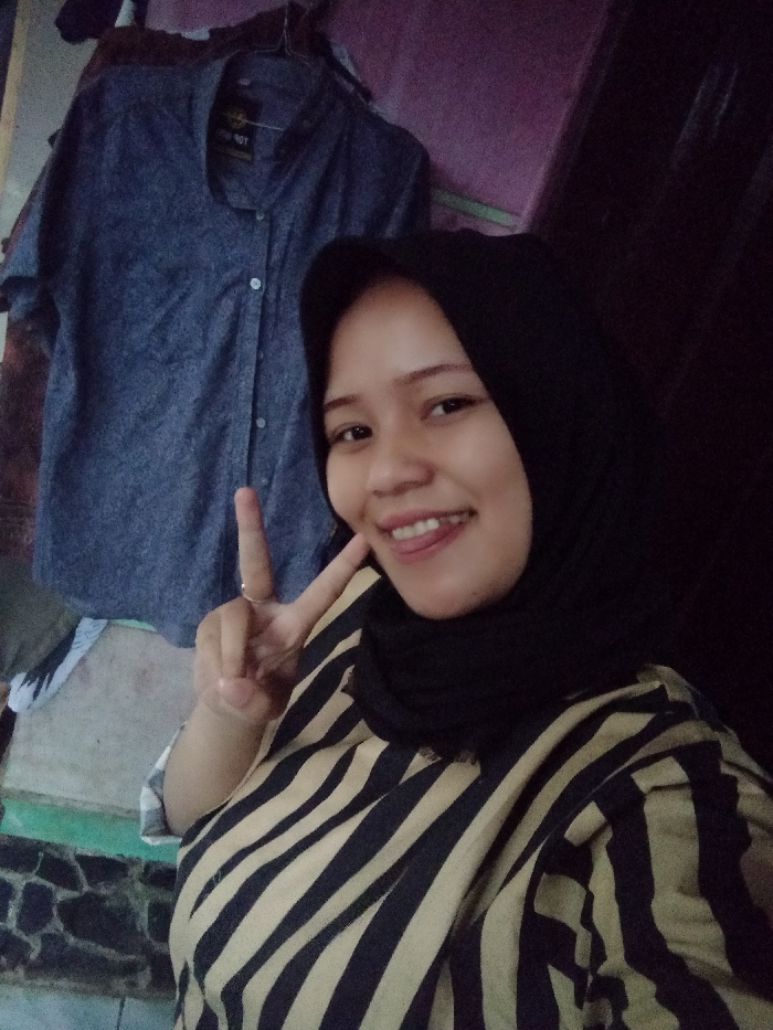 A female individual is depicted in a close-up indoor portrait, positioned on the right side of the frame, within Lumajang, Indonesia. She wears a black hijab and a black and beige horizontally striped shirt. Her expression is a smile, with visible teeth and a partially extended tongue. Her right hand is raised to head level, forming a V-sign with the index and middle fingers; a ring is present on her right ring finger. In the background, to the left of the individual, a blue-grey short-sleeved button-up shirt with white buttons is hanging. A label bearing 'TOP BOY' is visible on the hanging shirt. The wall behind is painted with varying shades, including a light purple hue on the upper left. A patterned, dark-toned surface with a horizontal green stripe is visible on the lower left of the background. The lighting is moderate.