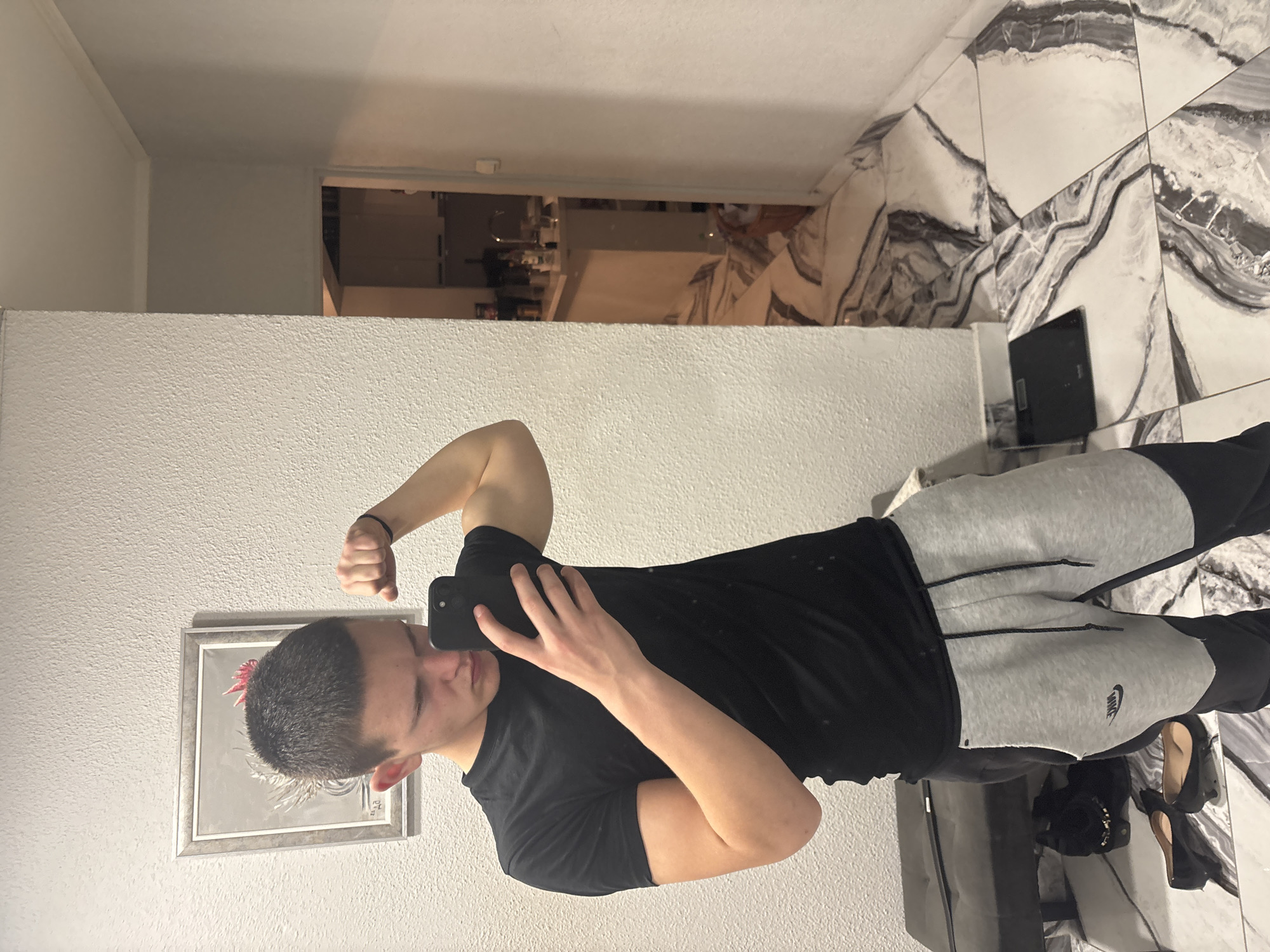 A young man poses for a selfie, flexing one arm and holding his phone. He wears a black t-shirt and gray Nike sweatpants. Behind him is a white wall with a framed picture and an adjacent room with a glimpse of a kitchen or dining area. The floor is a modern marble tile design in black, white, and gray. A black electrical panel is on the wall by the floor, and a black suitcase and a pair of black shoes are near the bottom of the frame.