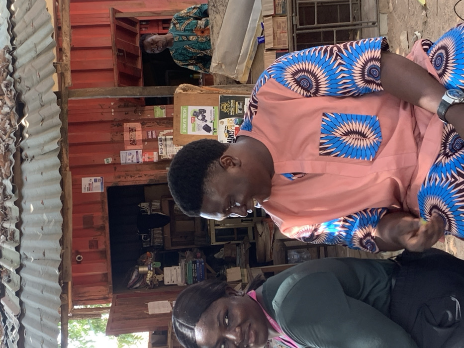 This image captures a street scene in Apata Yakuba, Nigeria, featuring three individuals in front of a corrugated metal structure. In the foreground, a dark-skinned female with long dark hair, wearing a dark green top and a pink lanyard, is visible on the left, looking directly at the camera with a slight smile. To her right, a dark-skinned male is seated, facing right in profile, smiling and looking downwards. He wears a peach-colored traditional Nigerian garment with blue, black, and peach circular patterns on the sleeves, pocket, and bottom hem, matching trousers, and a watch on his left wrist. His left hand holds a small, light-colored object. In the background, a commercial establishment constructed from red corrugated metal panels is visible, topped with a weathered corrugated metal roof covered in leaves and debris. Several printed signs are affixed to the red wall, including "AZEEZAT," "2 RAYS TECH," and "NO-GAS," along with others bearing text like "MARKET PRICES." Inside the open doorway of this structure, a dark-skinned male wearing a green patterned traditional shirt and an orange lanyard is standing behind a counter, looking left. The interior of the shop appears cluttered with various items and boxes. The ground in the immediate foreground is uneven, suggesting dirt or unpaved terrain. Green foliage is visible on the far left side of the frame.