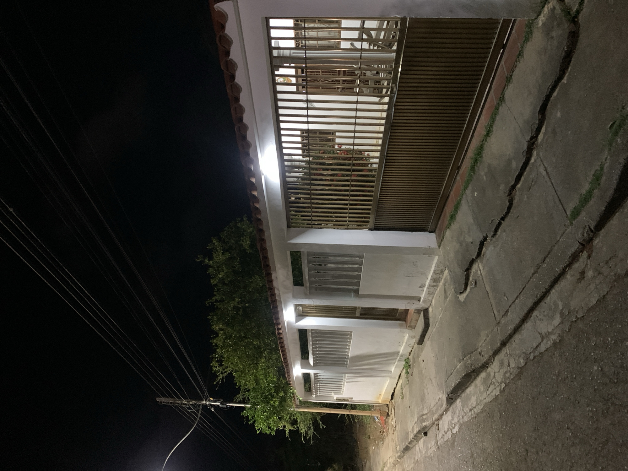 A low-angle, nighttime view of a one-story building in La Tagua, Venezuela. The building is white with brown horizontal metal bars covering the front windows and entryway. A tree with green foliage grows along the building's side. Power lines stretch across the dark sky to the left of the building. The sidewalk in front of the building is cracked, and a street runs along the right side. The scene appears dimly lit.