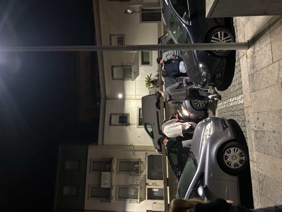 The image depicts a nighttime street scene on Rua Conselheiro Rocha Peixoto, 4750-264 Barcelos, Portugal. Artificial lighting illuminates multi-story buildings lining the street; a building on the left features "CLINICA SONO" signage and balconies with ornate railings. The street surface is cobblestone, with paved sidewalks. Eight individuals, primarily young adults, are present. One individual with light-colored hair is partially visible in the immediate foreground, left. The remaining seven are clustered in the mid-ground around two vehicles, a dark grey hatchback and another dark-colored vehicle, which appear to have been involved in a collision. The dark grey hatchback exhibits damage to its front driver's side, including a partially dislodged bumper. One person in a light-colored hoodie is bent over, examining the damaged area, while another person in a dark jacket leans into the driver's side of the same vehicle. Additional vehicles include a silver-grey hatchback parked in the foreground, left, and a black hatchback parked to the right of the central cluster. A white commercial van is parked further down the street on the left. A streetlamp pole stands prominently on the right side of the frame.