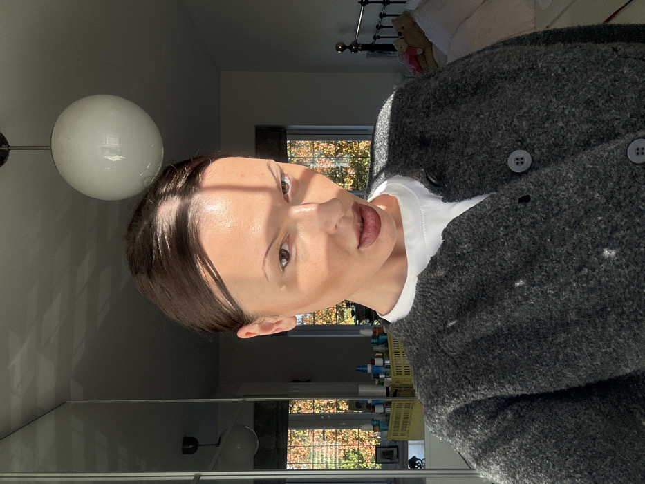 An eye-level portrait depicts a female individual with dark hair pulled back, thin eyebrows, and dark lipstick, facing the camera directly. Strong natural light from the right casts prominent shadows across her face. She wears a white crew-neck t-shirt under a dark grey textured cardigan with light grey buttons. The background on the left features a large mirrored surface reflecting a window that reveals autumn foliage and various bottles and containers, some within a yellow plastic crate, on a shelf below. On the right, a white spherical pendant light fixture hangs from the ceiling. Another window displays similar outdoor autumn trees. A dark metal bed frame with white bedding and a light-colored stuffed animal is partially visible on the far right. The scene is located within an interior space in the city of Wealden, United Kingdom.