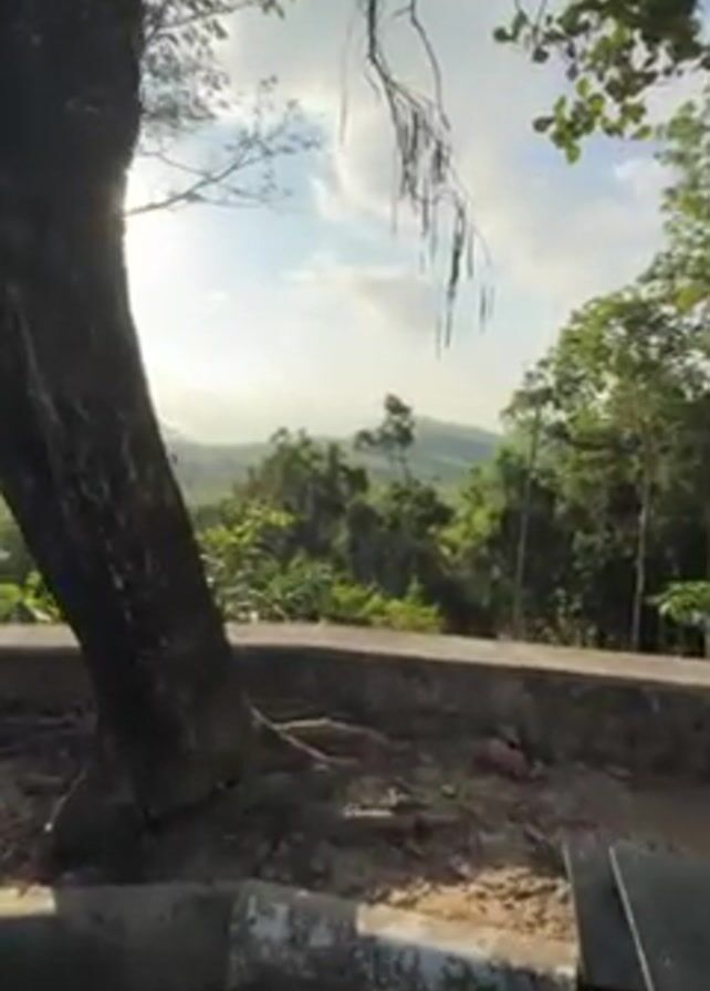 The video presents a scenic view from what appears to be an elevated outdoor spot, possibly a viewing platform or patio. A large tree with exposed roots sits in the foreground, obscuring part of the view. A low concrete wall runs along the edge of the platform. Beyond the wall, lush green vegetation covers the landscape, with taller trees rising above a dense forest. In the distance, the ocean can be seen under a cloudy sky with the sun peeking through. A black table with a metal frame is visible in the corner of the frame. No people are visible in the shot.