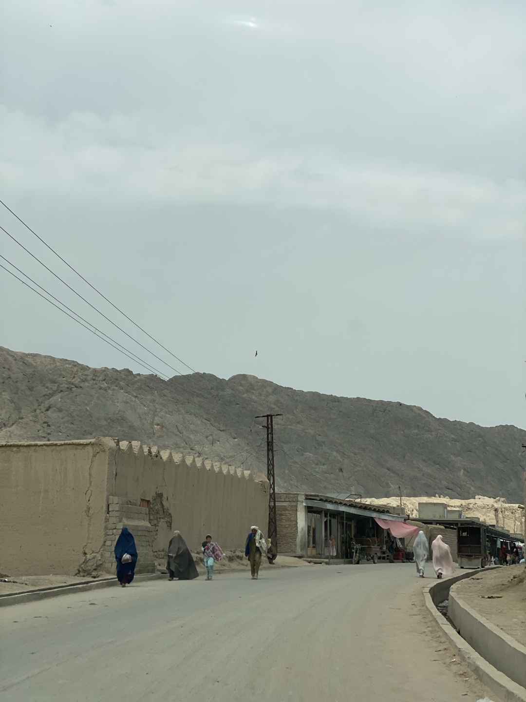 The image depicts a street scene in Kandahar, Afghanistan. The sky is overcast. The landscape is dusty and arid, with barren mountains in the background. The foreground is dominated by a paved road, and people are walking along it. Some wear traditional burqas. A low, crumbling wall lines one side of the road. Several small, open-front shops line the other side of the road, indicating a commercial area. Utility poles and wires stretch across the sky.