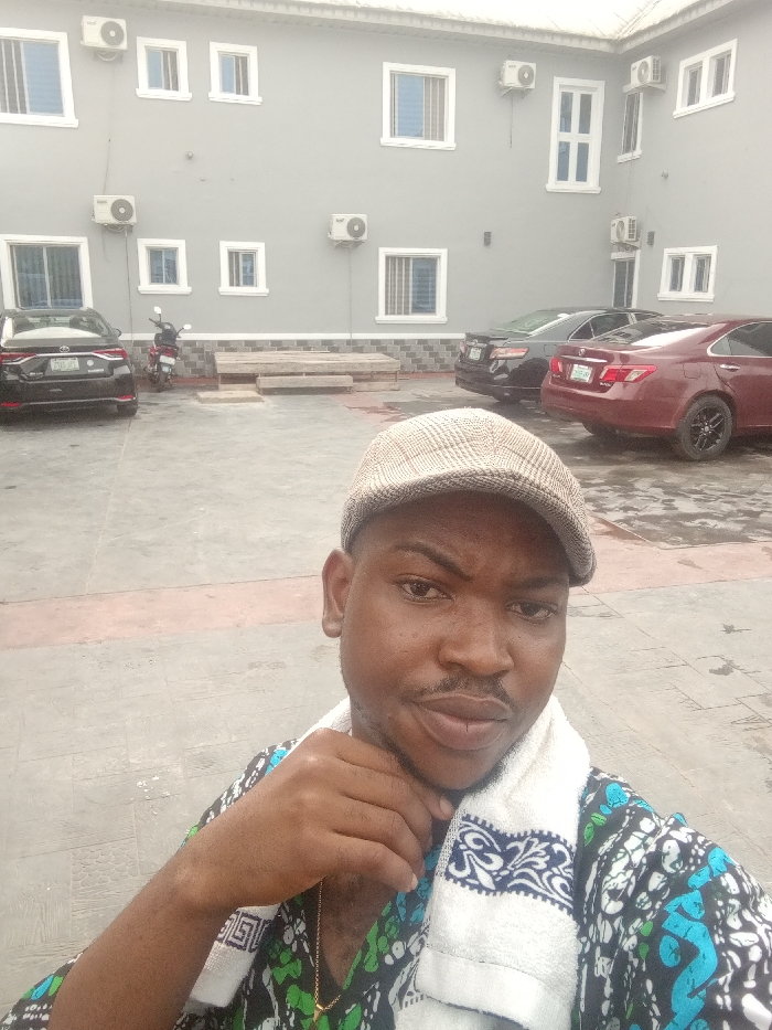 The image portrays a male individual in a selfie-style shot within the city of Igrwre-Ovie, Nigeria