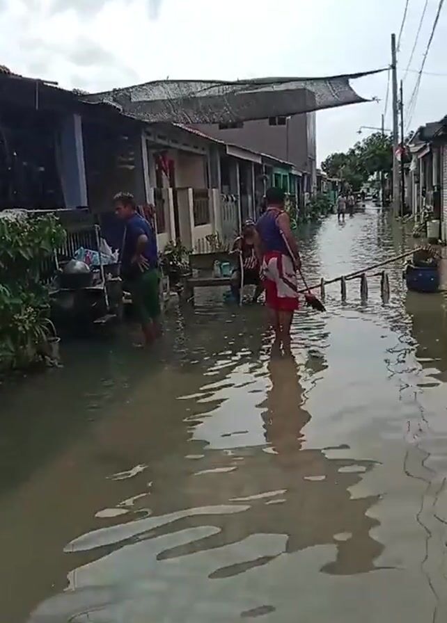 The video depicts a street in a residential area flooded with muddy water. Several people are seen wading through the water. One man in a blue shirt and green shorts is standing near a cart and looking around. A woman in a red and white outfit is walking towards the camera, carrying a ladder-like contraption. Another person is sitting in a chair in front of one of the houses. The houses appear to be built close together, and some have items outside, such as potted plants and household objects. The water level is high enough to submerge the lower parts of the houses and other structures along the street. Powerlines stretch across the sky above the flooded street. The sky is overcast.