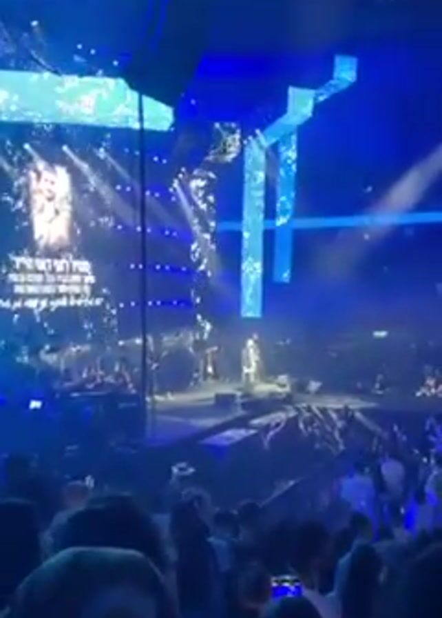 concert in a large arena, bathed in blue light. A band is performing on a stage with a large screen displaying visuals and text in Hebrew. The audience, visible from the back, is packed tightly and faces the stage. Many people are holding up their phones, likely recording the performance. A spotlight sweeps across the crowd. The arena's ceiling is visible, with lighting fixtures and architectural elements.