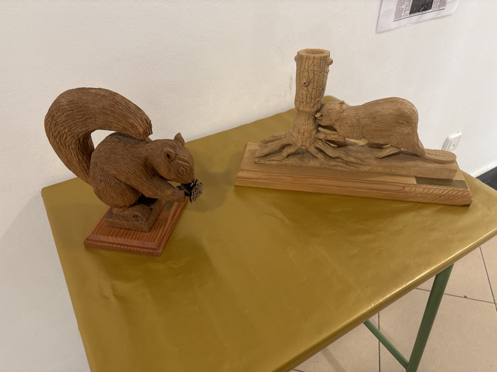 This image depicts two wooden animal carvings displayed on a table in an indoor setting within the city of El Espinar, Spain