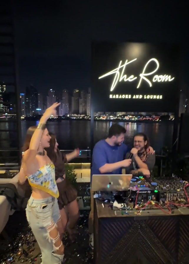 A nighttime scene captures four people celebrating at "The Room Karaoke and Lounge", set against a backdrop of a dark harbor lined with illuminated buildings. In the foreground, a woman with light-brown hair dances energetically. To her right, two men stand behind a DJ setup. The man on the left, in a blue shirt, holds a microphone and seems to be singing, while the man on the right, with long hair and glasses, controls the DJ equipment. The woman on the left has her arm around the dancing woman. Confetti litters the ground near the dancing woman. The DJ setup is intricate, with many knobs, wires, and a laptop visible. The sign behind the group, "The Room KARAOKE AND LOUNGE," is lit up in a stylish script. The background shows a body of water reflecting city lights and a skyline of tall buildings.