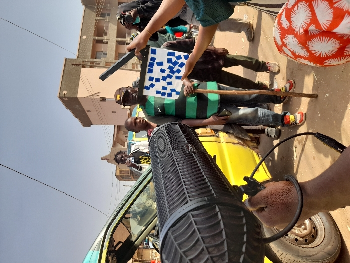An outdoor scene in Kaduna South, Nigeria, depicts a public gathering, possibly a film or photo shoot, under a clear, pale blue sky. In the immediate foreground, a person's hand, partially visible on the left, holds a black blimp-style audio recording device, likely a Sennheiser S2000 shotgun microphone, positioned towards the center of the frame. To the right of the audio device, another person's arm and hand hold a white rectangular board adorned with multiple scattered blue squares. Part of an orange and white patterned fabric is visible at the bottom right. Central to the midground is a light yellow vehicle, possibly a bus or large van, with its passenger door open. Standing near the open door, a man wearing a green and black striped long-sleeve athletic shirt, blue jeans, and multi-colored sneakers (red, yellow, white) is visible. He wears a brown baseball cap and holds a natural wooden staff in his right hand, looking directly towards the camera. Next to him, a young boy in a dark shirt is partially visible. Behind the yellow vehicle, another man in a white jacket over a black "AY" branded t-shirt stands, drinking from a small container. Further back and to the right, a person in a dark hoodie and face mask operates a DSLR camera. Additional individuals are partially visible in the mid-to-background, observing the scene. The background features several multi-story buildings with various architectural details, including a prominent peach-colored building with dark brown trim on the upper levels. The ground appears to be unpaved earth or dirt. A single power line or cable is visible across the sky.
