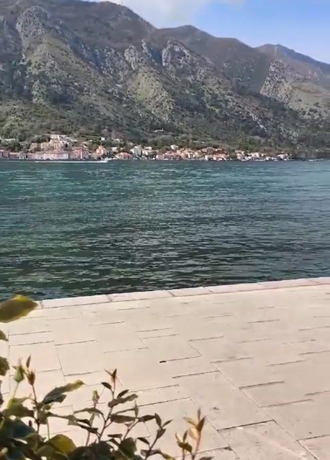 The video presents a scenic view of a waterfront area. The camera pans from some greenery on the lower left, across a stone-tiled walkway, to reveal a body of water, likely a bay or harbor, framed by mountains in the background. In the middle of the scene, there is a tall, black, metal structure with a flat surface, which is possibly a table or stand. A small white boat is anchored in the water. The water is clear with slight ripples. Across the water, there is a row of buildings at the foot of the mountains. The sky is blue with some clouds.