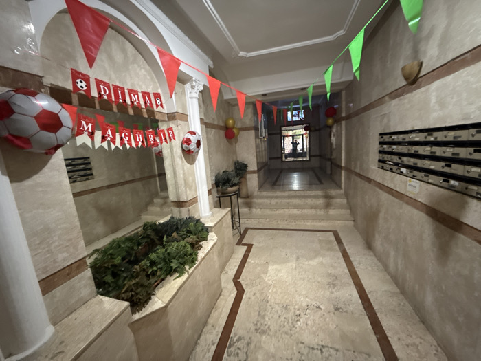 An indoor entrance area is decorated for a soccer-themed celebration. Red and white banners reading "DIMA MAGHRIB" hang above greenery-filled planters. Soccer ball-shaped balloons add to the festive atmosphere. A line of mailboxes is visible on the right-hand wall, and green pennant banners are strung above. The floor is light-colored tile with dark trim. A person is silhouetted in the doorway at the end of the hallway.