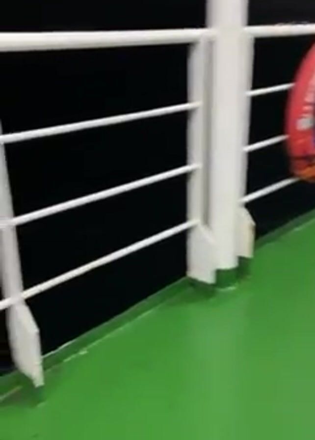 The camera is positioned on a boat with a green deck and white railings