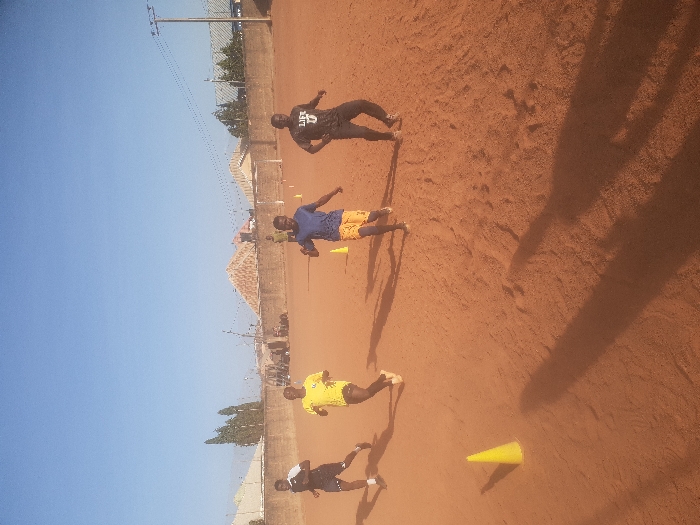 This image captures an outdoor training session in Barakin Lerawi, Nigeria, under a clear, light blue sky