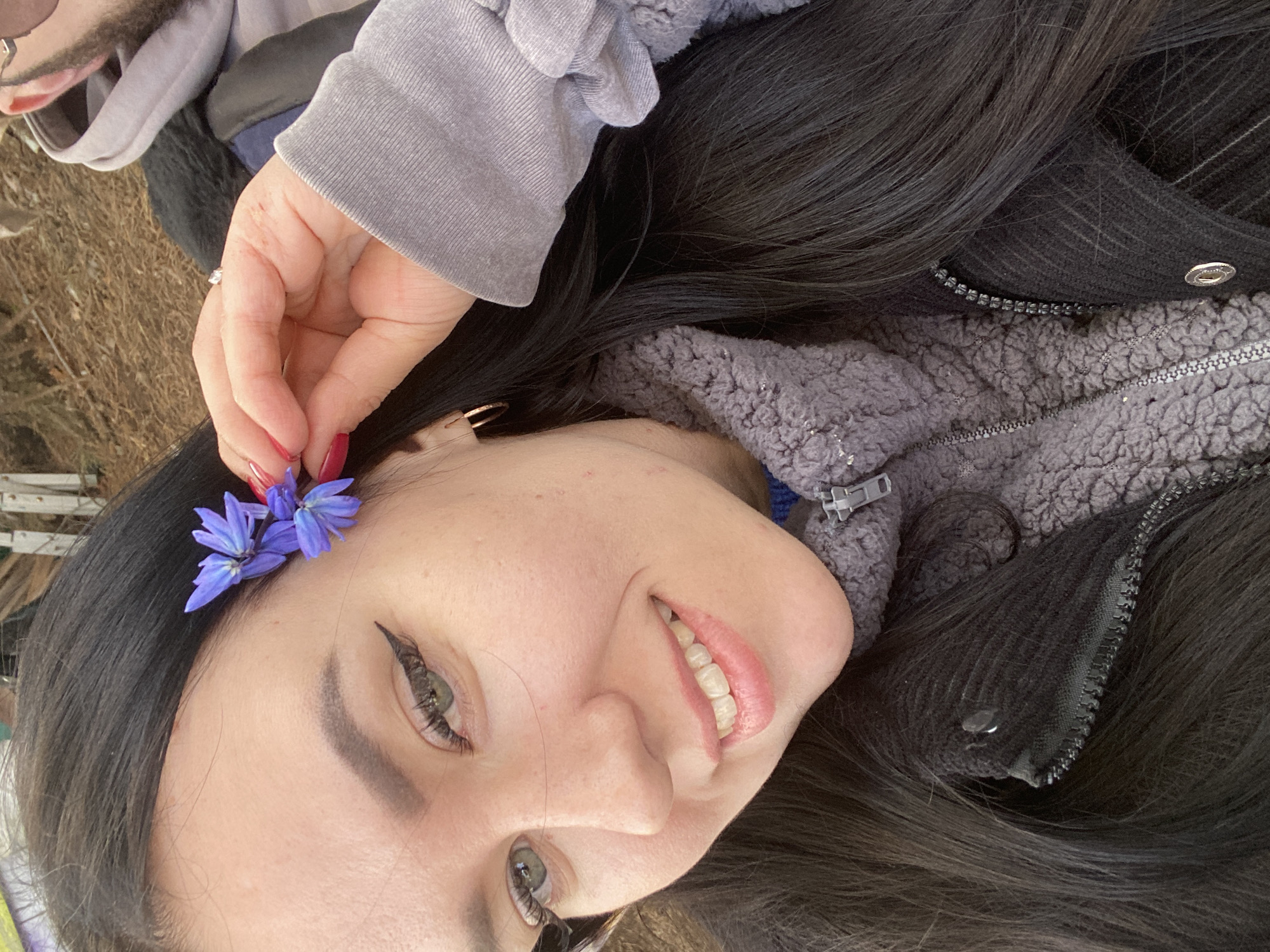 A woman is positioned in the frame, her head angled towards the camera. She is adorned with blue flowers near her hairline, her hair is dark and flowing. She's smiling, and her fingernails are painted red. Her clothing includes a gray, textured fleece-like material. The surroundings suggest an outdoor location, as hinted by the background elements. The city of Chaikovsky, Russia, is not discernible from this image.