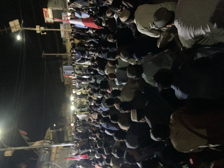 This nighttime image captures a large public gathering of adult males in the city of Qilla Saifullah, Pakistan