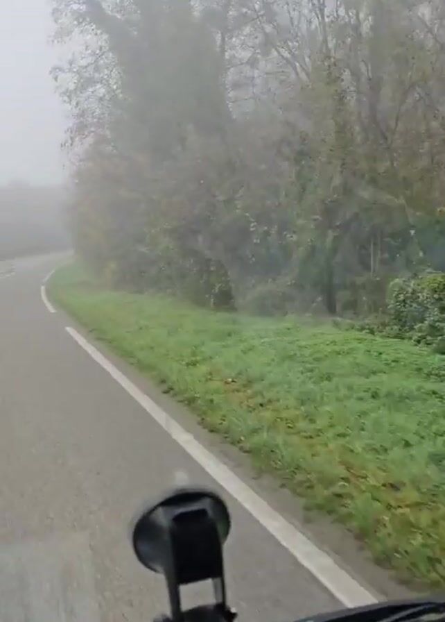 first-person perspective from inside a vehicle driving on a paved road. The road has two lanes, with white lines marking the lanes. The weather is foggy, and visibility is reduced. Trees line both sides of the road, and some of their leaves are brown and yellow. A red traffic cone is visible in the middle of the road as the vehicle approaches a fork. A car can be seen briefly in the distance, coming around a bend in the road. A suction-cup phone mount is visible in the lower part of the frame.