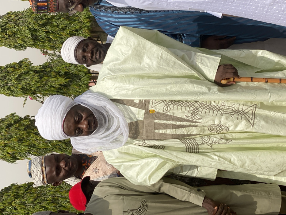 An outdoor scene in Rigasa, Nigeria, depicts a central adult male surrounded by at least five other adult males under bright daylight