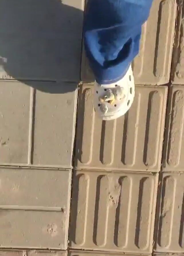 A person wearing blue jeans and white Crocs with decorative charms walks along a sidewalk paved with rectangular, beige tiles. A narrow strip of tactile paving, indicated by raised linear bumps, runs parallel. The camera angle changes, rotating the view 180 degrees to reveal the sidewalk leading to a street with pedestrians, parked vehicles, and trees. One person is wearing a white hazmat suit.