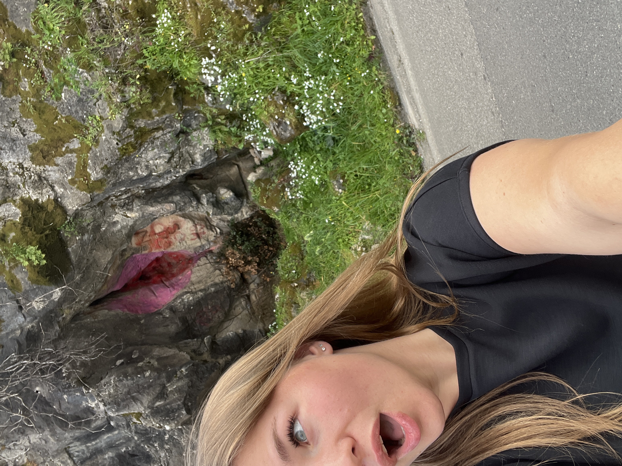 The image depicts a selfie-style photograph taken outdoors in Đuraševići, Montenegro. The primary subject is a fair-skinned woman, visible from the chest up and positioned in the lower-left and central-left of the frame. She has long, straight, light brown hair, light blue-green eyes, and is wearing a plain black short-sleeved top. Two small, clear stud earrings are visible in her left earlobe. Her mouth is open, revealing her teeth and pink lips, indicating an expression of surprise or awe, with her gaze directed upwards and to the right. In the background, a substantial grey rocky outcrop is visible, covered in patches of green moss and some dry, bare tree branches. A prominent feature on the rock is a large, irregularly shaped painted area in bright pink, with a darker red interior, explicitly resembling female genitalia. To the right of this, less distinct red graffiti is partially visible. Below the rock face, a vibrant green grassy slope, dotted with numerous small white and some yellow flowers, borders a grey paved road surface visible in the lower-right portion of the image. The lighting suggests an overcast or indirectly lit daylight scene.