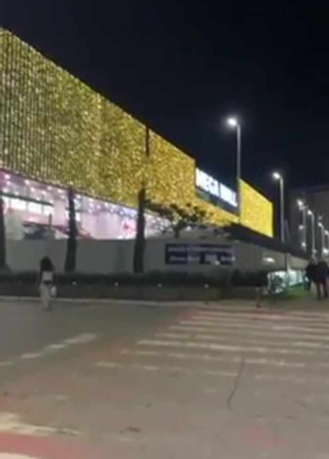 At night, the video shows the exterior of a large MEGA MALL building adorned with strings of lights. The building is rectangular with a flat roof, and the lights completely cover the façade, giving it a shimmering gold appearance. A sign that reads “MEGA MALL” is clearly visible on the building’s upper right side. Below the sign is a smaller sign with text in a different language. Three tall, thin trees are planted in front of the building along a low concrete barrier. People are walking along the sidewalk, and a crosswalk with faded red and white stripes cuts across the foreground. Streetlights illuminate the area. The sky is dark, suggesting it is late in the evening.