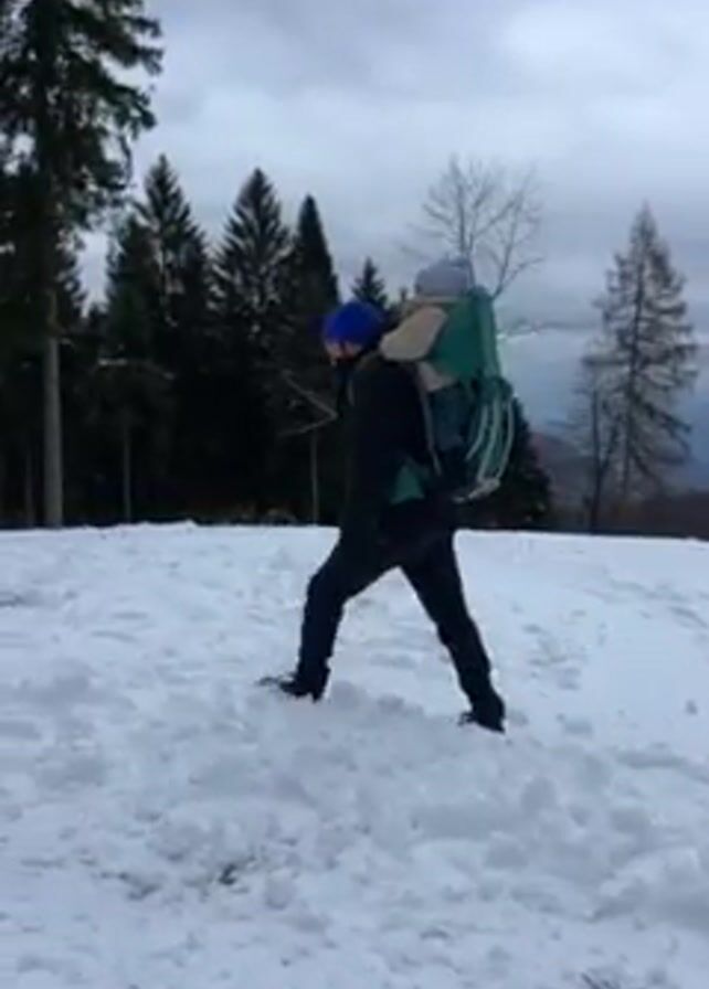 A man wearing a blue beanie, dark jacket, and dark pants is walking across a snowy field. He is carrying a child in a green backpack carrier. The child is wearing a light-colored hat and is facing forward in the carrier. Behind the man is a line of tall evergreen trees. The sky is overcast. The man is wearing snowshoes. He is walking towards the right side of the frame.