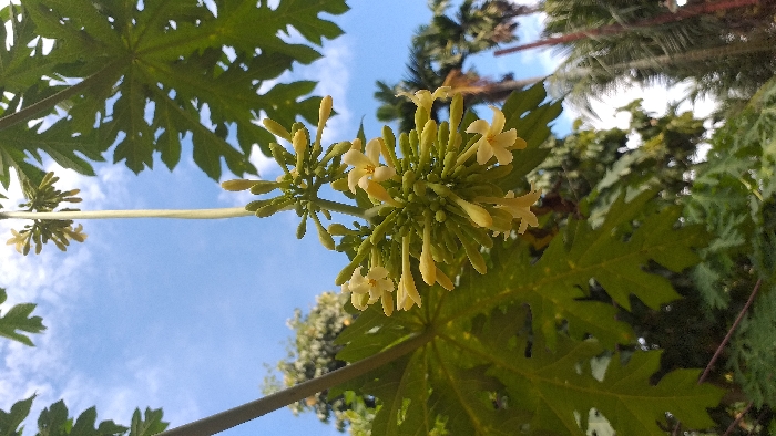 - "The image displays a close-up, upward-angled view of a cluster of light yellow to cream-colored papaya flowers (Carica papaya) and numerous unopened buds, emerging from a central, light green stem" by FM-6oDkC2, licensed under CC BY 4.0