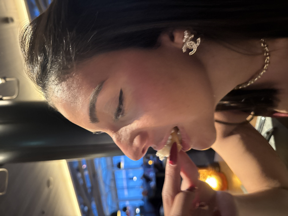 An image depicts a female subject in right profile, mid-meal within an upscale indoor dining environment. The subject has dark hair, a closed right eye with black winged eyeliner, and is consuming a piece of white food, possibly bread, held between her lips. A finger with red nail polish is touching the food near her mouth. She wears a gold-colored chain choker necklace and silver-toned earrings styled as the Chanel logo, encrusted with small stones. The blurred background features other patrons, tables, hanging light fixtures, and large windows revealing indistinct city lights against a dark sky. A warm, orange glow from a table lamp or candle is visible in the lower left foreground. The location is an establishment in the city of Unknown, Unknown.
