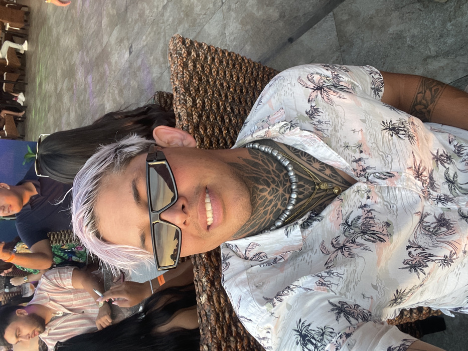 A man with light blonde hair and large black sunglasses relaxes in a brown wicker chair. He wears a light-colored shirt with a tropical palm tree pattern, a pearl necklace, and a gold pendant. Tattoos cover his neck and left arm. Other people are visible in the background, seated at tables, engaged in conversation. The setting appears to be an outdoor restaurant or lounge.