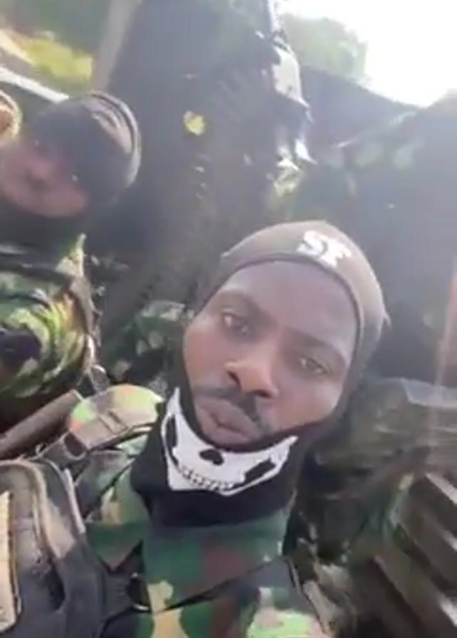 several soldiers riding in the back of a military vehicle. One soldier is holding the camera and taking a selfie video. All soldiers are wearing camouflage uniforms and protective gear, including helmets and face masks. The soldier taking the video is wearing a black balaclava with a skull design. The environment appears to be a road, with trees and other vegetation visible in the background. The sky is bright and sunny. "NIGERIAN ARMY" is printed on the chest of one soldier.