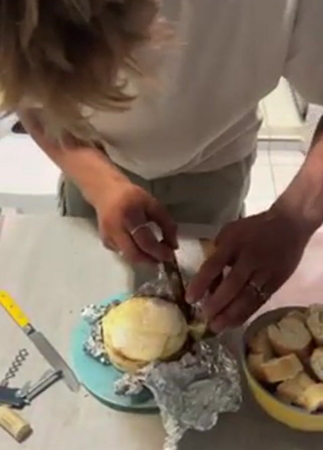A man with blond hair, wearing a white t-shirt and khaki shorts, cuts into a wheel of brie cheese on a light blue plate. The cheese is wrapped in aluminum foil. A yellow-handled knife and bottle opener are to the left of the plate, while a yellow bowl full of sliced bread sits to the right. The man wears rings on both ring fingers. The scene takes place on a light-colored countertop in a kitchen setting. Electronic dance music is playing in the background.